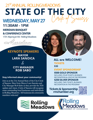 Rolling Meadows-State of the City Luncheon Images Gallery Image × Set a Reminder Enter your email address below to receive a reminder message. Email address Select the amount of Days before the event -- Select Days Before Event -- 1 Day 2 Days 3 Days 1 Week Captcha Validation Please complete the Captcha Submit Date and Time Wednesday May 27, 2026 11:30 AM - 1:00 PM CDT Location Meridian Banquet & Conference Center 17010 Algonquin Rd Rolling Meadows Set a Reminder Enter your email address below to receive a reminder message. Email address Select the amount of Days before the event -- Select Days Before Event -- 1 Day 2 Days 3 Days 1 Week Captcha Validation Please complete the Captcha Submit Share × Print Email Add to Calendar Facebook Twitter LinkedIn Tell a Friend × Select Calendar Type × Google Yahoo iCal (Outlook, Apple, or other)